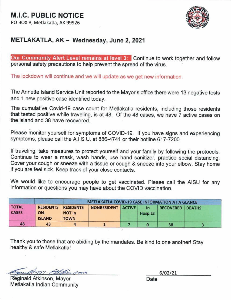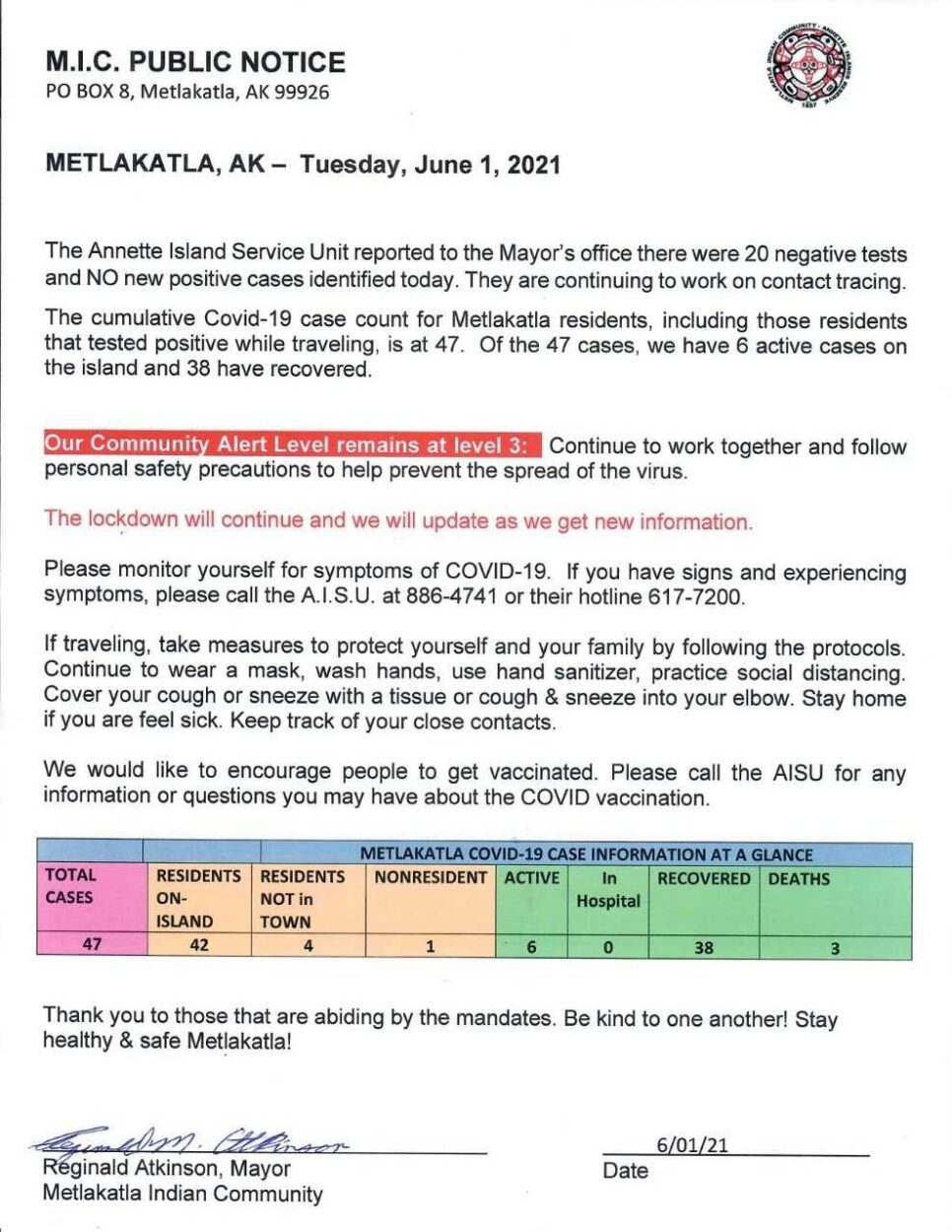 Local officials in Metlakatla have banned most gatherings since the outbreak began in early May and continue to urge residents to get vaccinated against COVID-19. For more information on COVID-19 vaccination and testing in Metlakatla, call the Annette Island Service Unit at 886-4741.