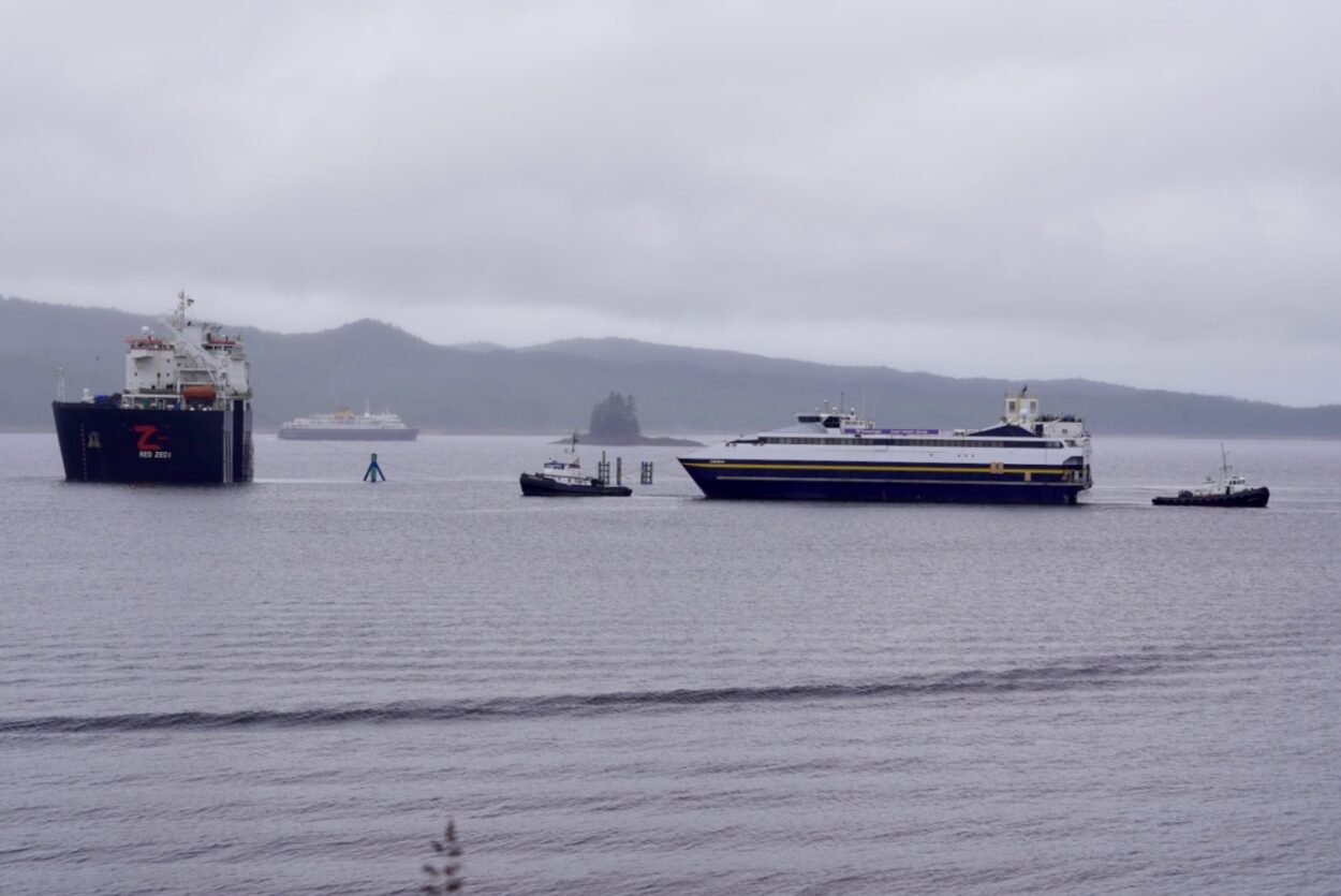 Two former Alaska Marine Highway ferries started their journey to Spain Friday morning. A crowd gathered as tugs pulled the fast ferries Fairweather and Chenega from Ketchikan’s Ward Cove out to a waiting transport ship.