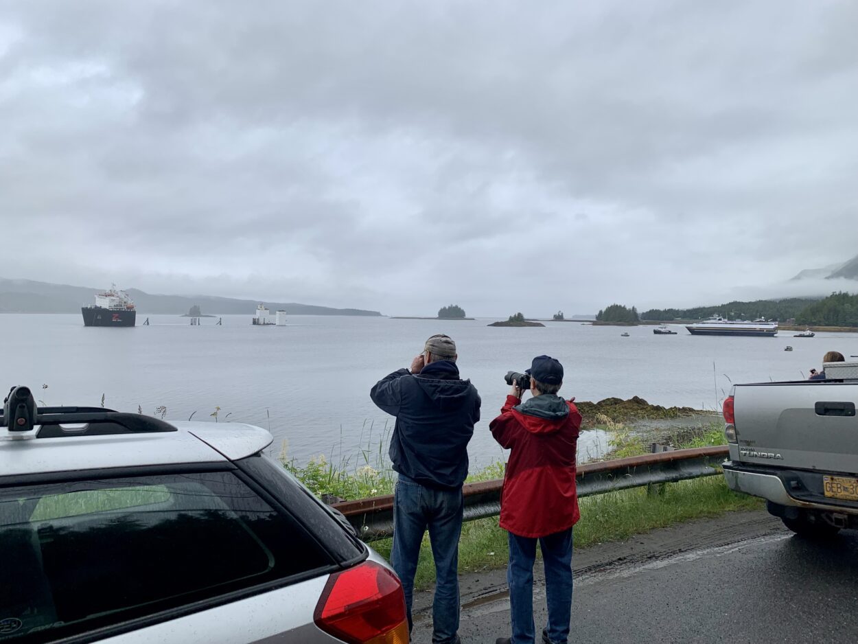 Onlookers, including retired ferry captain Bill Hopkins, left, watch as tugs drag the Chenega towards the Red Zed 1 Friday morning. (Eric Stone/KRBD)