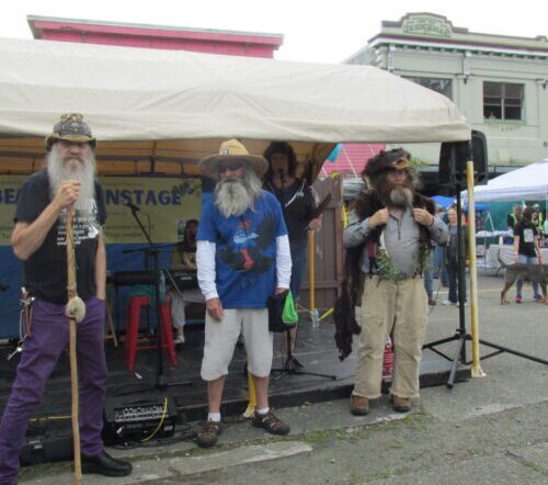 Participants in the Blueberry Arts Festival Beard and Mustache ‘Wild Man’ contest. From left Scott Markwell, Richardo Burquez and winner Doug Parry (KRBD staff photo by Maria Dudzak).