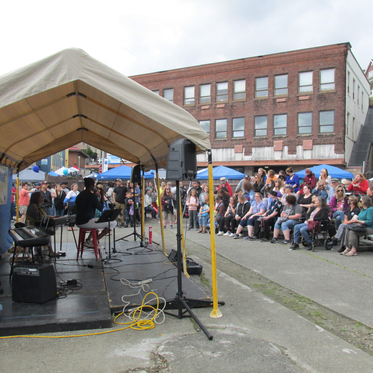 Spectators listen to Joe Williams IV and Diane Slagle perform on the Blueberry Arts Festival Mainstage (KRBD staff photo by Maria Dudzak).