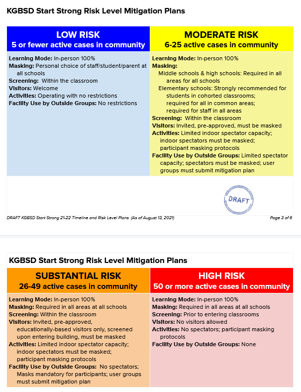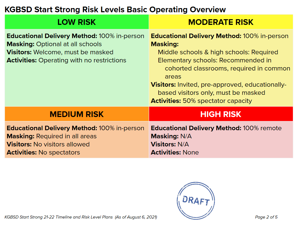 At high risk, masks would be required for all students and staff, visitors would be barred, and students would have to answer screening questions before entering classrooms.