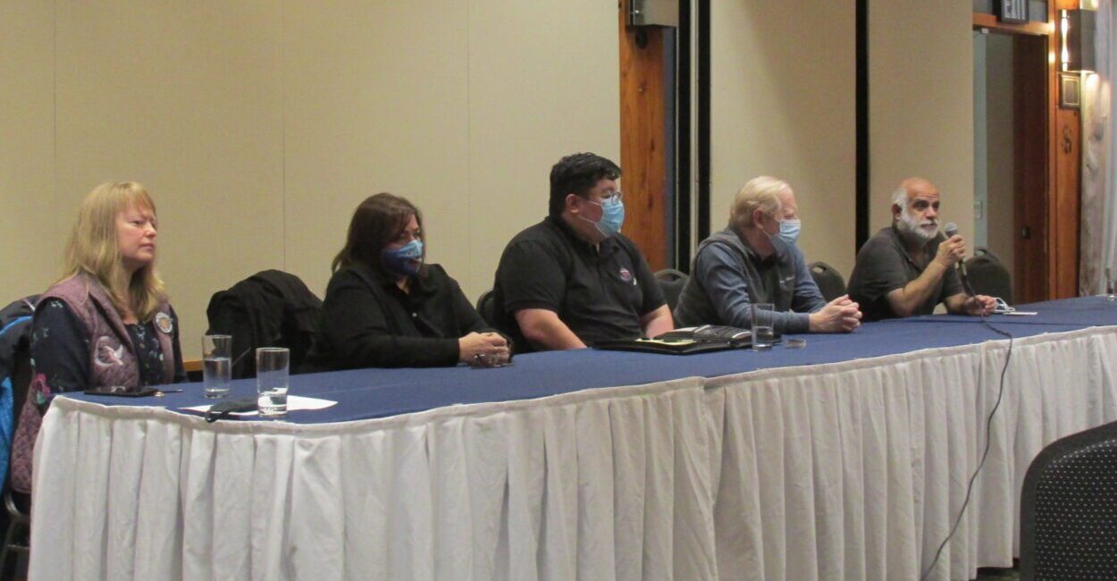 Candidates for City of Ketchikan municipal office at the Chamber of Commerce forum September 29, 2021. From left, Lallette Kistler, Janalee Gage, Bronson Olson, Dave Kiffer and Jai Mahtani (KRBD staff photo by Maria Dudzak).