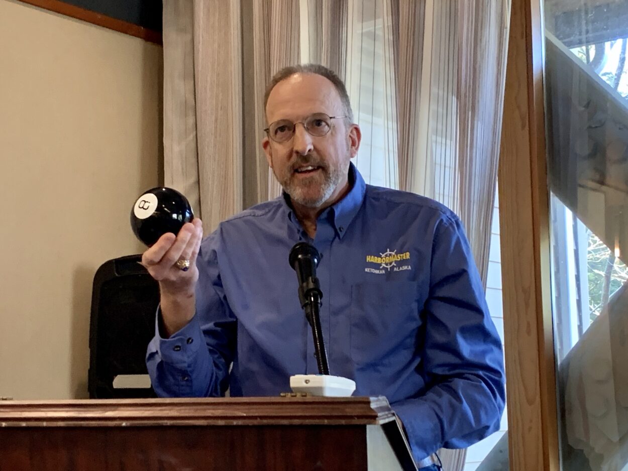 Ketchikan Port and Harbors Director Steve Corporon speaks to Ketchikan businesspeople about the pandemic on March 13, 2020. Corporon retired in November 2020. (Eric Stone/KRBD)