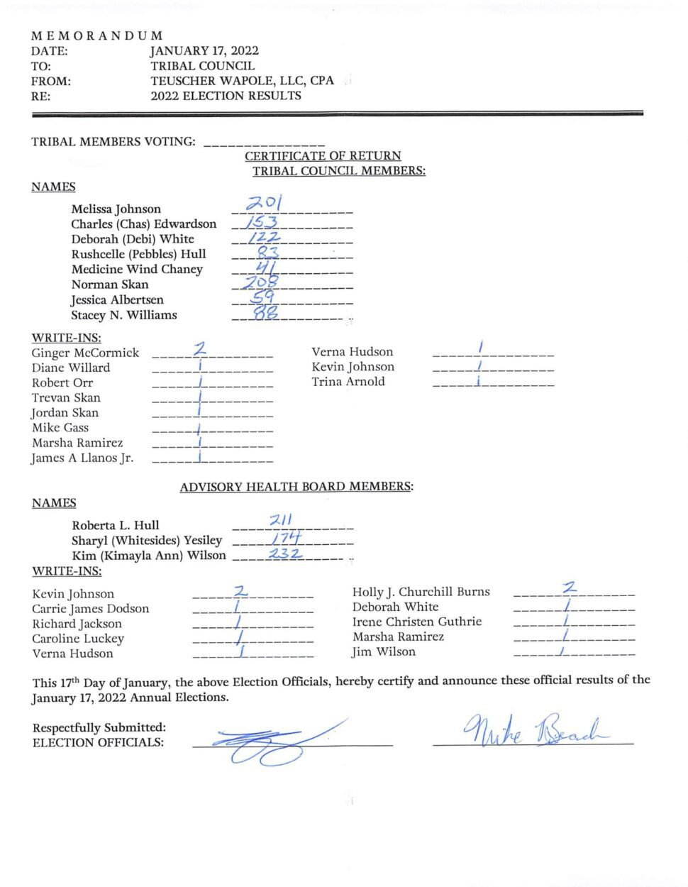 An incumbent and a challenger won seats on KIC’s Advisory Health Board, a body that advises the Tribal Council on health care policy. Kim Wilson came in first with more than 230 votes. Roberta Hull won the other two-year term, roughly 20 votes behind. Incumbent board chair Sharyl Yeisley was defeated, earning roughly 170 votes.