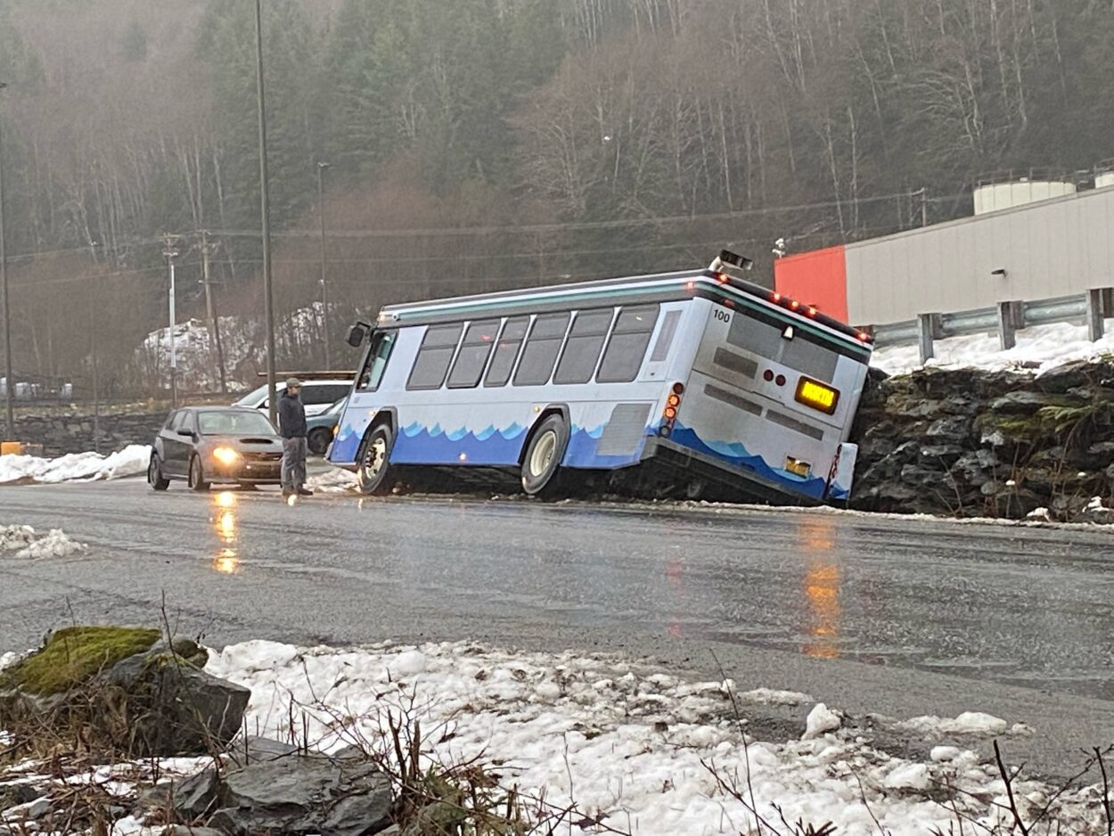 A northbound public transit bus wound up in a ditch Thursday afternoon near Ketchikan’s Walmart store. Borough Transit Director Kyan Reeve says the Silver Line bus went off-road shortly after 2:30 p.m. and Ketchikan police responded. He says there were no reports of serious injuries.