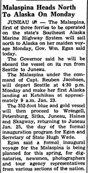 While Alaska’s first state-owned ferry was the Chilkat, which initially shuttled passengers and vehicles between Haines, Skagway and Juneau, a 1963 Associated Press story notes that the Malaspina was the first ferry to sail for the newly-established Alaska Marine Highway System.