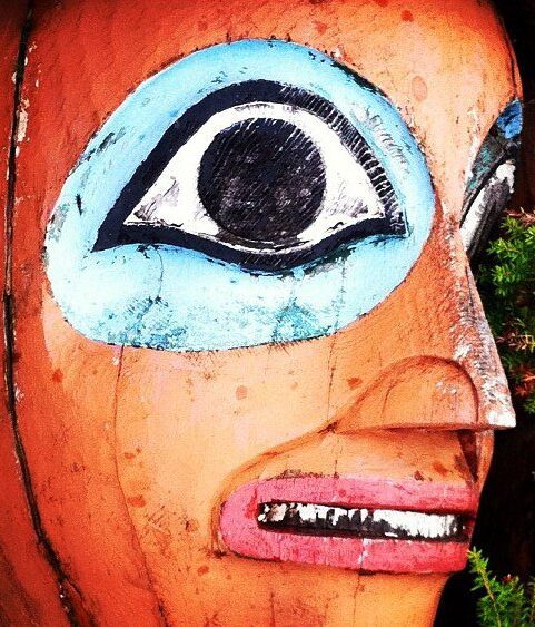Close up of a totem pole in Klawock (KRBD staff photo).