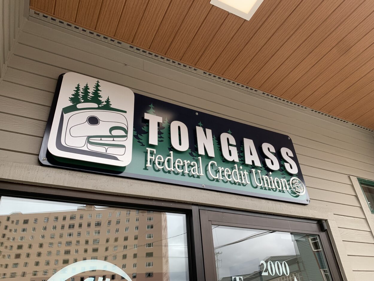 Tongass Federal Credit Union’s sign hangs over the entrance to its Ketchikan branch. (Eric Stone/KRBD)