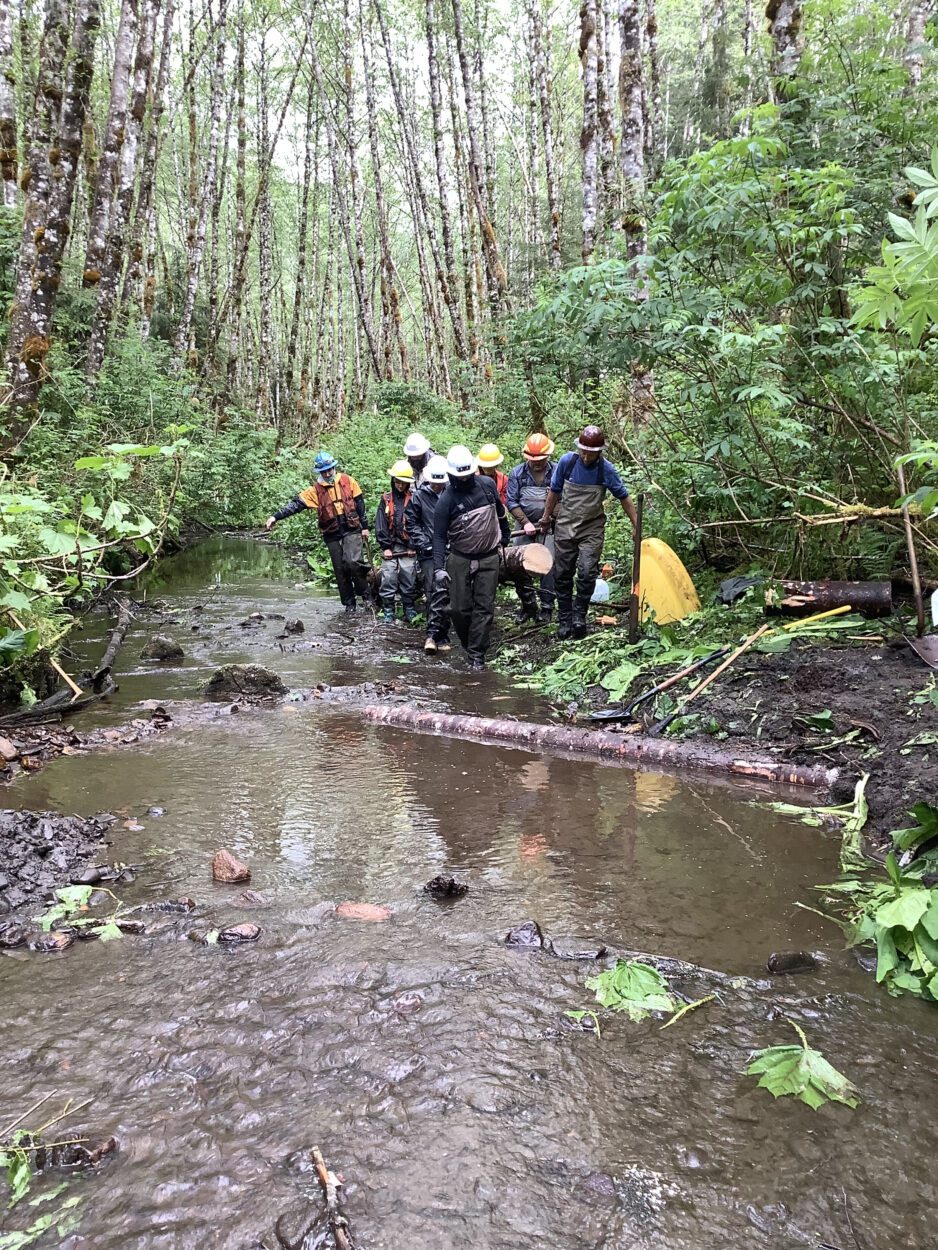 To make the project happen, the coalition partnered with Ketchikan Indian Community and the U.S. Forest Service, and got to work training hand crews. They were tasked with restoring parts of the creek that machines couldn’t get to, using tools like chainsaws, cinches, pulleys and axes.