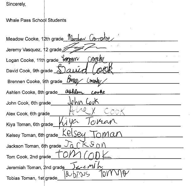 But Whale Pass School’s head teacher, Anthony Cook, said it’s an issue close to home for even the town’s youngest residents. The proposed sale would take out 292 acres of mixed-species old growth lining the hill above the town of 100. Cook said it could affect the kids’ hunting prospects, their jobs at the town’s lodge, or even their homes, just 100 feet away from the clear-cut boundary.