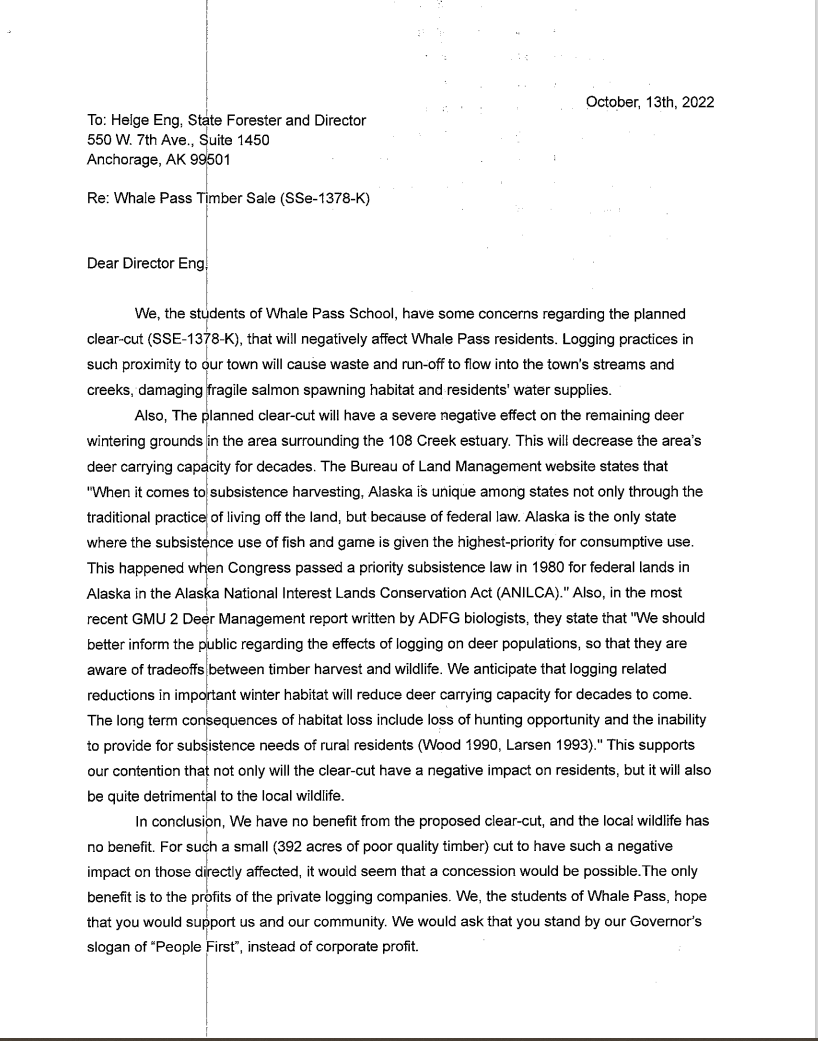 At the end of their letter, the students ask Helge Eng, the state forester, to, as they put it, “’stand by our governor’s slogan of ‘People First,’ instead of corporate profit.”