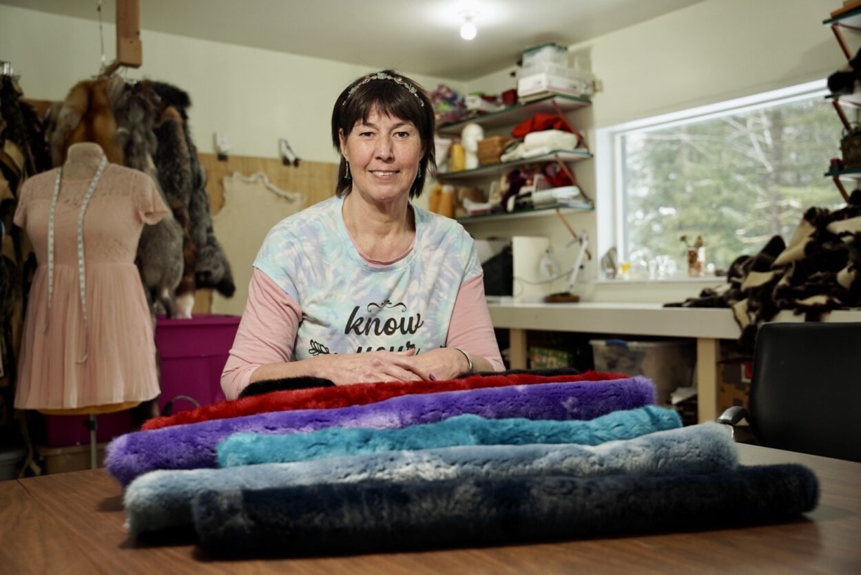 Christy Ruby stands in her studio on the north end of Ketchikan, next to a table piled high with soft blue, red and purple sea otter pelts. These are her bestselling colored sea otter, and since 2017, she’s used the dyed fur in her traditional handicrafts. Ruby sells her creations online and through social media. She’s also set up at several local craft events over the years.