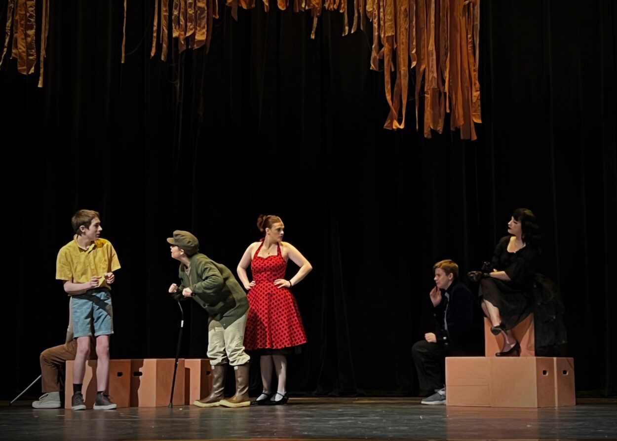 Varela-Kossak: We started rehearsals and started the production at the end of January. So how the class is set up is it’s a semester long class. So last semester, we did a show called Almost Maine. Most of those kids stayed in the class and then we added a few more. So we started in January with auditions. I cast the show. We got started right away on rehearsals, and then once a week, we would have a production meetings, we checked in with our production team. We would create our plan and they would give us a presentation on their designs and their concepts and their ideas. And then they started work. So they’d go into the shop and start building and painting and dyeing fabric and ordering costumes and making costumes.