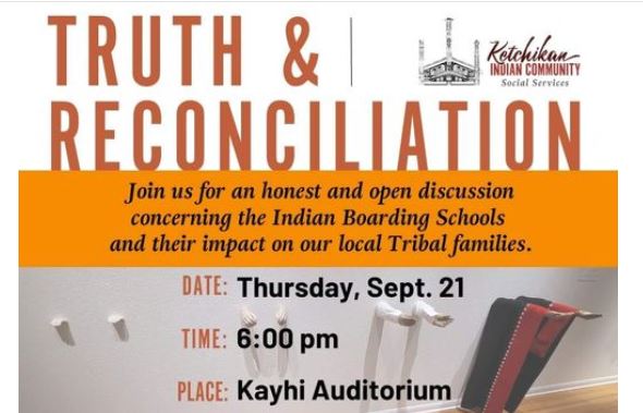 Ketchikan Indian Community is hosting a discussion and sharing session “Truth and Reconciliation” September 21 at 6 p.m. in the Kayhi Auditorium. Riley Boss and Ahl’lidaaw Gitnack’angeak give details.