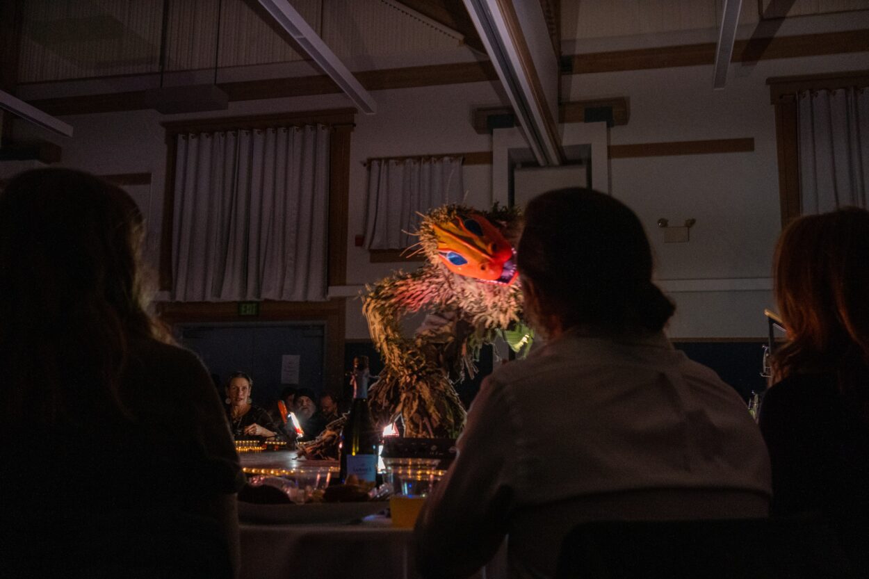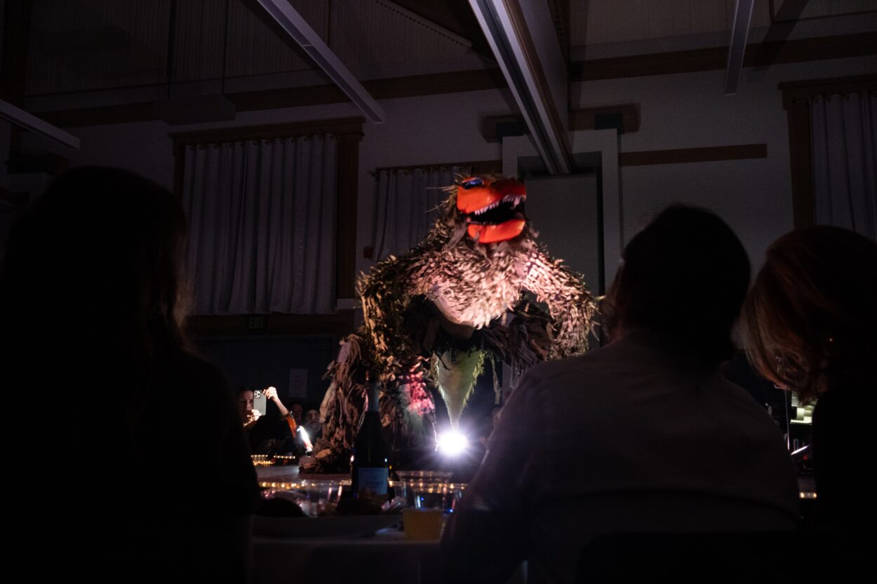 Then, the show takes a turn for the nightmarish. A creature shoulders its way through the curtains. It stands on four legs with bristled fur like tree bark and stares out at the crowd through blue eyes above a gleaming orange maw. It looks like something from the Studio Ghibli film Spirited Away. It’s the work of artist Evy Posey.