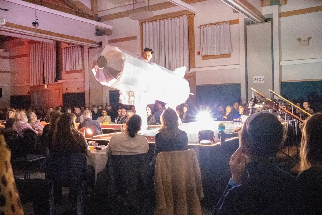 Fawn Breese, one of the younger models and artists, bursts onto stage from a roughly seven foot tall steampunk time machine she built with her mom.