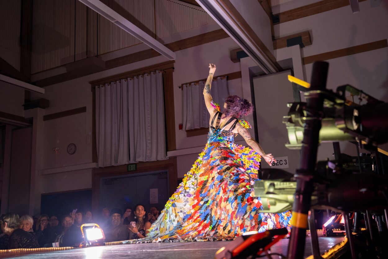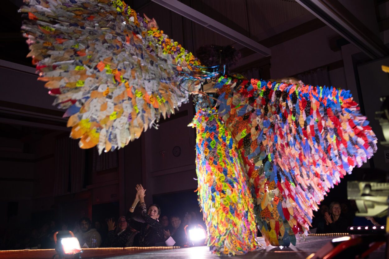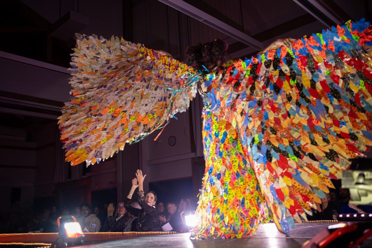 The first act they introduce is by Rhonda Green. The piece’s model, Green’s granddaughter Bailey Slanaker, struts down the runway, decked out in a spinning skirt of stacked buckets. It looks like she’s a hundred different swaying and spinning colors. The crowd is already on their feet.