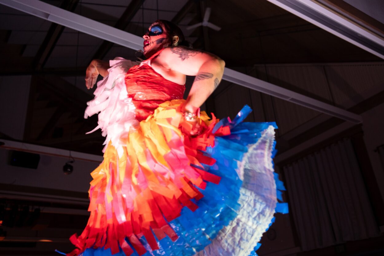 It’s the Ketchikan librarians. They form a circle at the end of the stage with their backs to the audience. Each red robe is different, featuring flames or hands reaching out for the word “freedom,” or one with a sniper target on the back. Then, each librarian throws open their arms one by one like a prize fighter before a match. Beneath their robes, each model wears a dress with a central message.