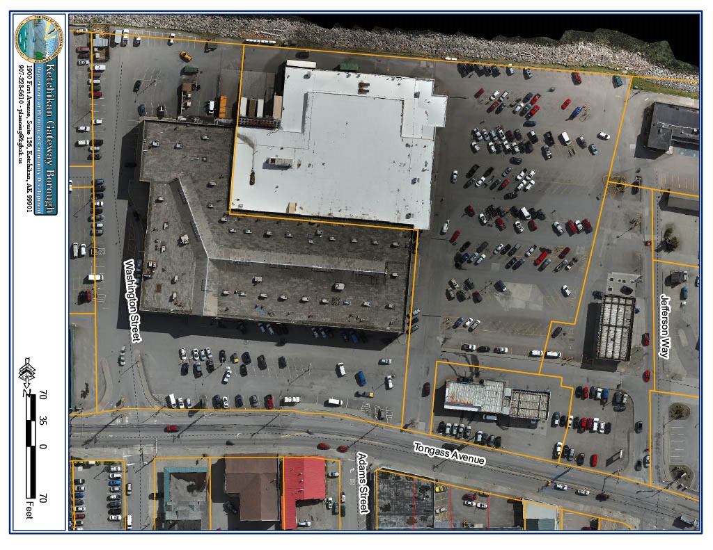 The borough’s plat map is an aerial satellite photo of the area. Tongass Avenue runs up the side like a spine. Then there’s Jefferson Way, a dotted line in the upper corner, bisected many times over by orange. The private easement is the property of multiple businesses.