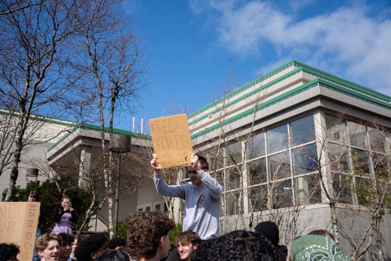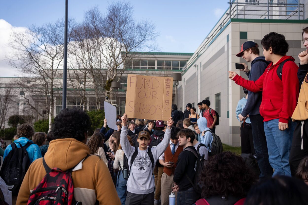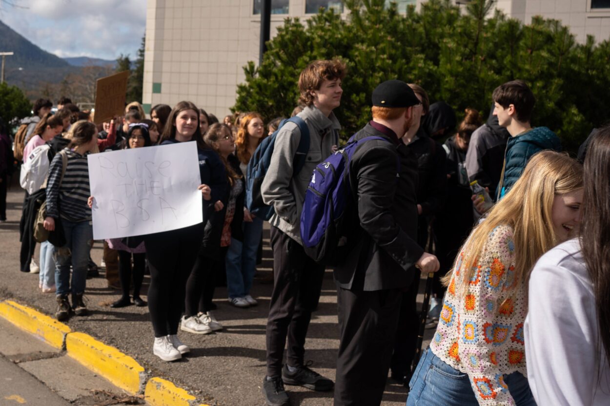 Students at Ketchikan High School took part in a statewide walkout, protesting Governor Mike Dunleavy’s veto of Senate Bill 140, a bipartisan state education measure that would have significantly raised state education funding for the first time in nearly a decade.