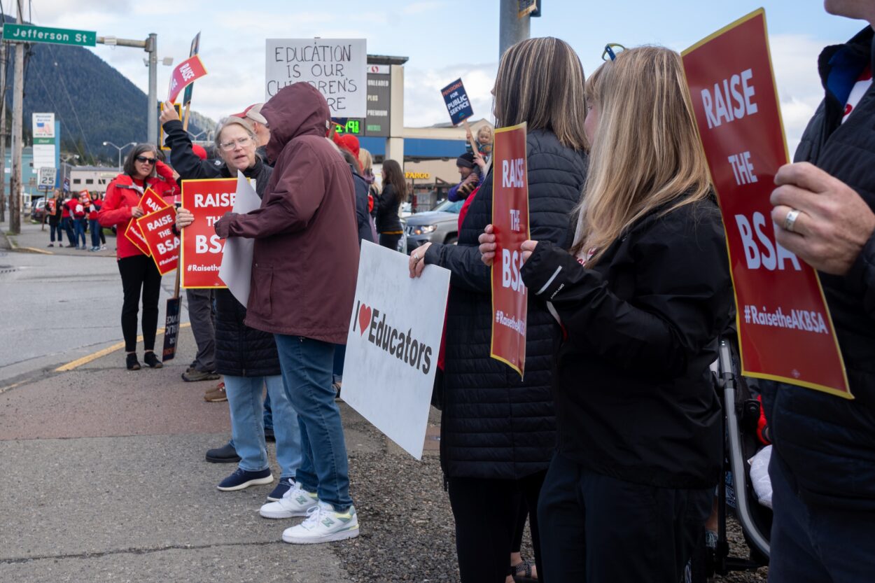 More than 100 Ketchikan educators gathered Wednesday afternoon, wearing red t-shirts and holding picket signs that said “raise the BSA” and “fund our schools.”