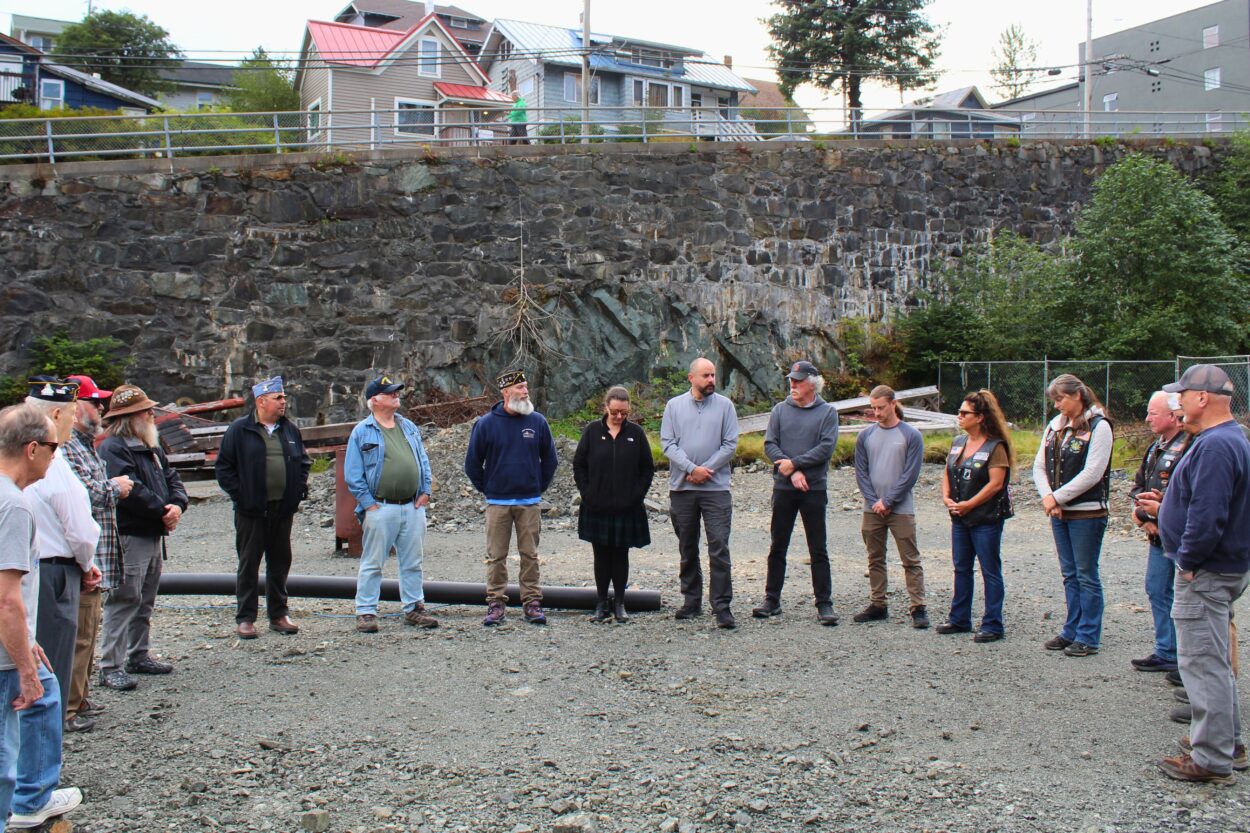 Members of Ketchikan’s American Legion chapter met at the site of their former building Tuesday, exactly one year after the historic building burned down.