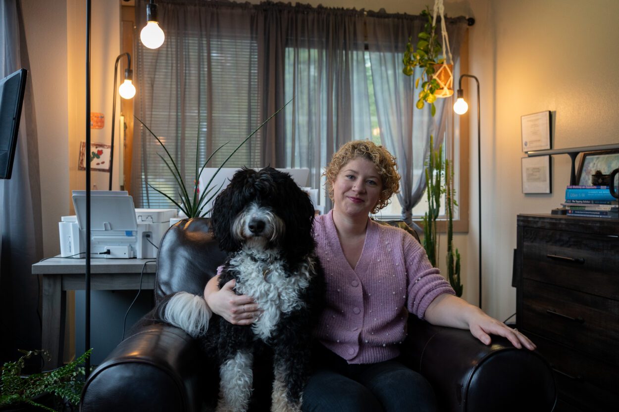 Caitlin Andrews has tea and a noise machine in her waiting room. Her enormous therapy dog, Guinness, snoozed in a big armchair next to me while we talked.
