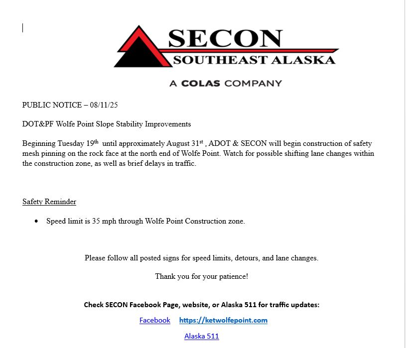 The project is being overseen by the Alaska Department of Transportation & Public Facilities. Here is a link to their Facebook Page for updates. The work is being done by SECON. Here is a link to the SECON Facebook Page.