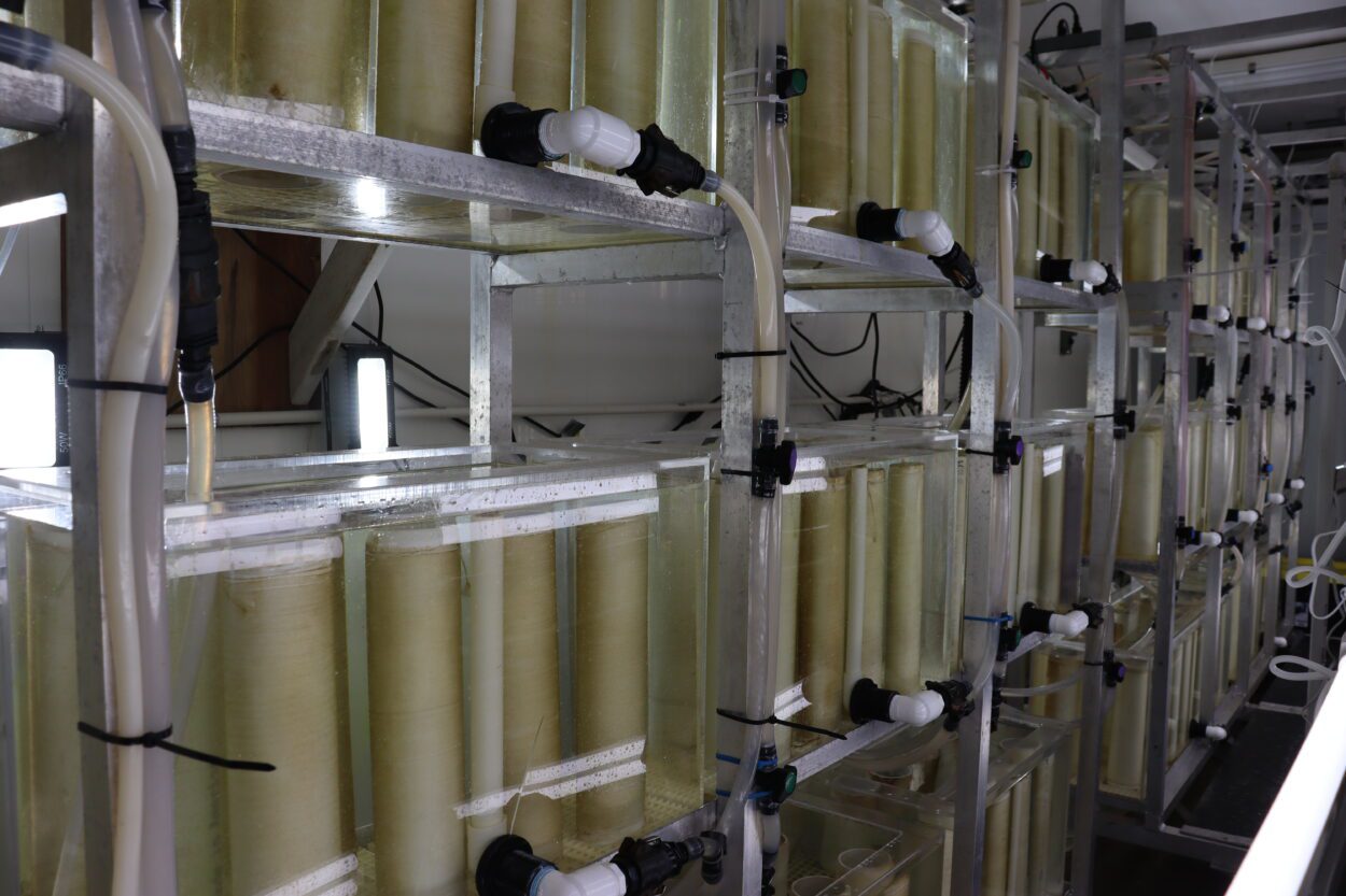 He points to a row of PVC pipes submerged in tanks of water. A fabric-like substance is spooled around them.