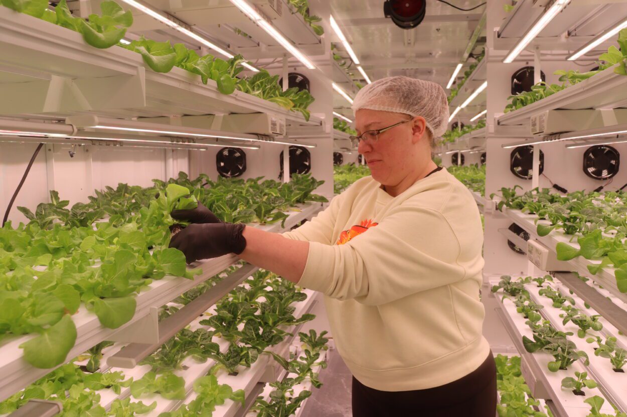 Jennifer Tucker stands between rows of romaine lettuce she grew inside of a climate-controlled shipping container. She grabs a bundle by the head and gives it a pull.