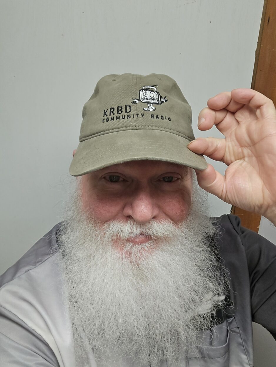 Soft khaki “dad hat” featuring Kevin Clevenger’s original design for KRBD Community Radio embroidered.
